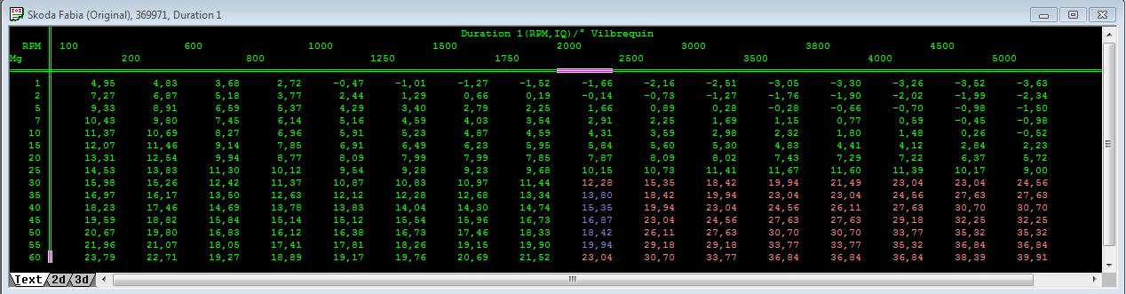 Bon petit deterrage pour vous faire part d'une prgo qui etait dans la voiture d'un ami skoda fabia vrs 1.9 TDI ASZ.Je ne suis surement pas un pro mais celui qui a fait cette prog ne l'est pas non plus.Je precise que je le connais depuis 3 ans bientot sa voiture ne roule plus vraiment turbo HS et surement autre soucis.Les durées c'est du grand n'importe quoi , la consigne est modé et pas la single.Les avances sont stock ainsi que la durée 0 etc